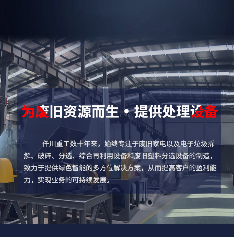 仟川重工數(shù)十年來(lái),始終專(zhuān)注于廢舊家電以及電子垃圾拆解、破碎、分選、綜合再利用設(shè)備和廢舊塑料分選設(shè)備的制造,致力于提供綠色智能的多方位解決方案,從而提高客戶(hù)的盈利能力,實(shí)現(xiàn)業(yè)務(wù)的可持續(xù)發(fā)展。